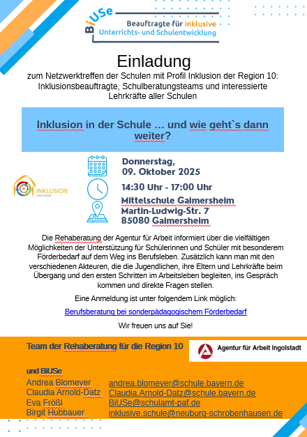 ByCS-Plattform: Kurs: Inklusive Schule Neuburg-Schrobenhausen und Pfaffenhofen (bayern.de) Auf der ByCS-Plattform Inklusive Schule Neuburg-Schrobenhausen und Pfaffenhofen gibt es genauere Informationen, Formulare, Tipps, Hilfen,... zum Thema Inklusion in den Grund- und Mittelschulen der Kooperationslandkreise. Den Einschreibeschlüssel erhalten Sie über den Flyer auf der TaskCard, in einer unserer Fortbildungen oder Sie schicken uns eine Mail. |